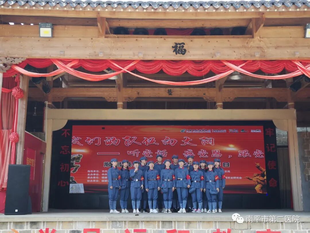 参观完展馆,我们在支部书记葛健君的带领下来到了中华苏维埃共和国闽贛省洋口政府,面对党旗,我们满怀忠诚,心怀敬畏地重温了入党誓词,表达对先烈的缅怀与敬仰之情。之后我们到大庙观看了一场红色演出,在支部书记葛健君的领唱下,全体党员上台,为大家献唱了一首红色歌曲《团结就是力量》。